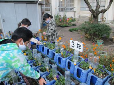 暖かくなってたくさんの花が咲くようにと、水と一緒に、子どもたち一人一人の愛情も注がれています。